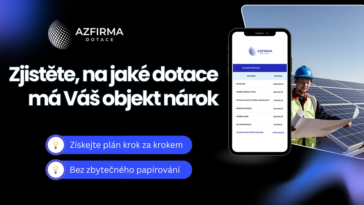 Uvidíte konkrétní výpočty dotací: zateplení, fotovoltaika, tepelná čerpadla, výměna rozvodů, trafostanice, modernizace výrobních hal...